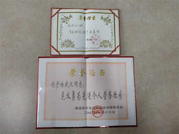 林武漢獲得個人榮譽(圖片來源:漳浦縣退役軍人事務局) 經(jīng)過幾番周折,男童的爺爺奶奶聯(lián)系上林武漢,電話里一再對恩人林武漢表示感謝,先后兩次電話表示要當面感謝。1月2日上午,男童爺爺奶奶帶著具有閩南特色的“四色”(甜點、鞭炮、蠟燭等4種物品)禮物和一面印有“退役不褪色 救人彰新功”的錦旗,送到林武漢家中。林武漢委婉收下“禮物”,但果斷拒收香煙和紅包。 1月3日下午,男童的爺爺及父親再次到林武漢所在單位贈送錦旗,以此感謝他危機時刻挺身而出,彰顯“退役不褪色、退伍不退志”的軍人作風。
