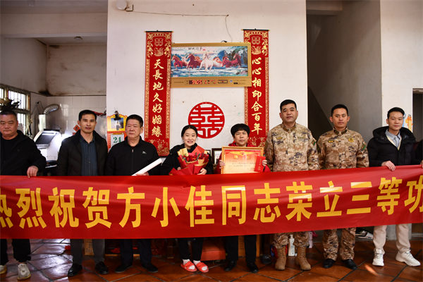 他是誰? 他是方小佳,云霄縣莆美鎮(zhèn)中柱村人 現(xiàn)任陸軍某部副連長 “咚咚鏘、咚咚鏘......”一陣陣喜慶的鑼鼓聲響徹街頭巷尾。1月24日,云霄縣人武部、縣退役軍人事務局組成軍地報喜小分隊,為榮立平時教育管理三等功的方小佳家庭送喜報,與軍屬共享榮耀和喜悅。 “您兒子一年為國家培養(yǎng)28名軍官,取得了令人驕傲的成績!離不開你們在背后默默無聞的支持”。在方小佳家中,縣人武部部長李超為軍屬披綬帶,頒發(fā)立功受獎喜報,與軍屬進行親切交談,向他們致以親切的慰問和崇高的敬意。