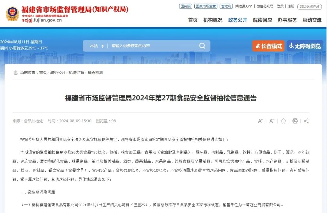 近日,福建省市場(chǎng)監(jiān)管局公布第27期食品安全監(jiān)督抽檢相關(guān)信息通告。 本期通告的監(jiān)督抽檢信息涉及26大類食品730批次。其中合格715批次,不合格15批次。不合格項(xiàng)目涉及微生物污染問(wèn)題、食品添加劑問(wèn)題、質(zhì)量指標(biāo)問(wèn)題、農(nóng)藥殘留問(wèn)題、重金屬污染問(wèn)題、其他污染問(wèn)題。