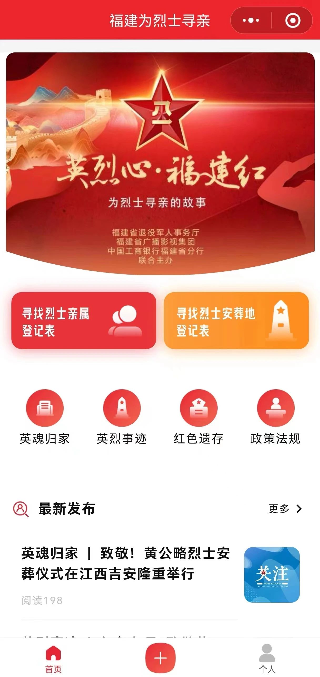 山河無恙,英雄歸家。第十一個烈士紀(jì)念日即將到來之際,福建省退役軍人事務(wù)廳今日正式上線開通“福建為烈士尋親”小程序。小程序是我省全面推進(jìn)烈士尋親工作的一項(xiàng)重要舉措,集成了為烈士尋親登記申請、尋親信息發(fā)布、英烈事跡宣傳、烈士紀(jì)念設(shè)施展示、政策法規(guī)普及等功能模塊,有效暢通退役軍人事務(wù)系統(tǒng)、群眾、媒體、社會組織等各界力量參與為烈士尋親工作的渠道。