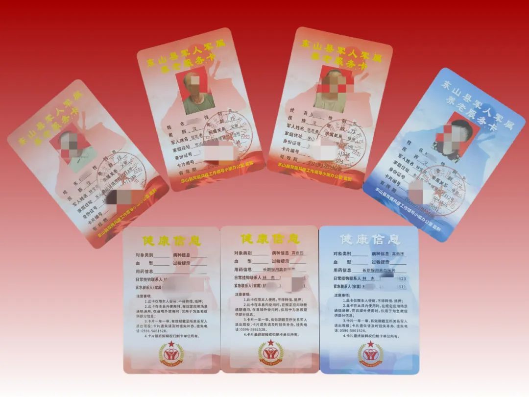 更實在的溫暖是東山縣雙擁共建工作領導小組同步發(fā)放的軍人軍屬養(yǎng)老服務卡,這張集成軍屬住址、健康檔案及緊急聯(lián)系人信息的卡片,已發(fā)放至全縣106名軍人軍屬手中,讓服務精準對接每個軍人家庭。