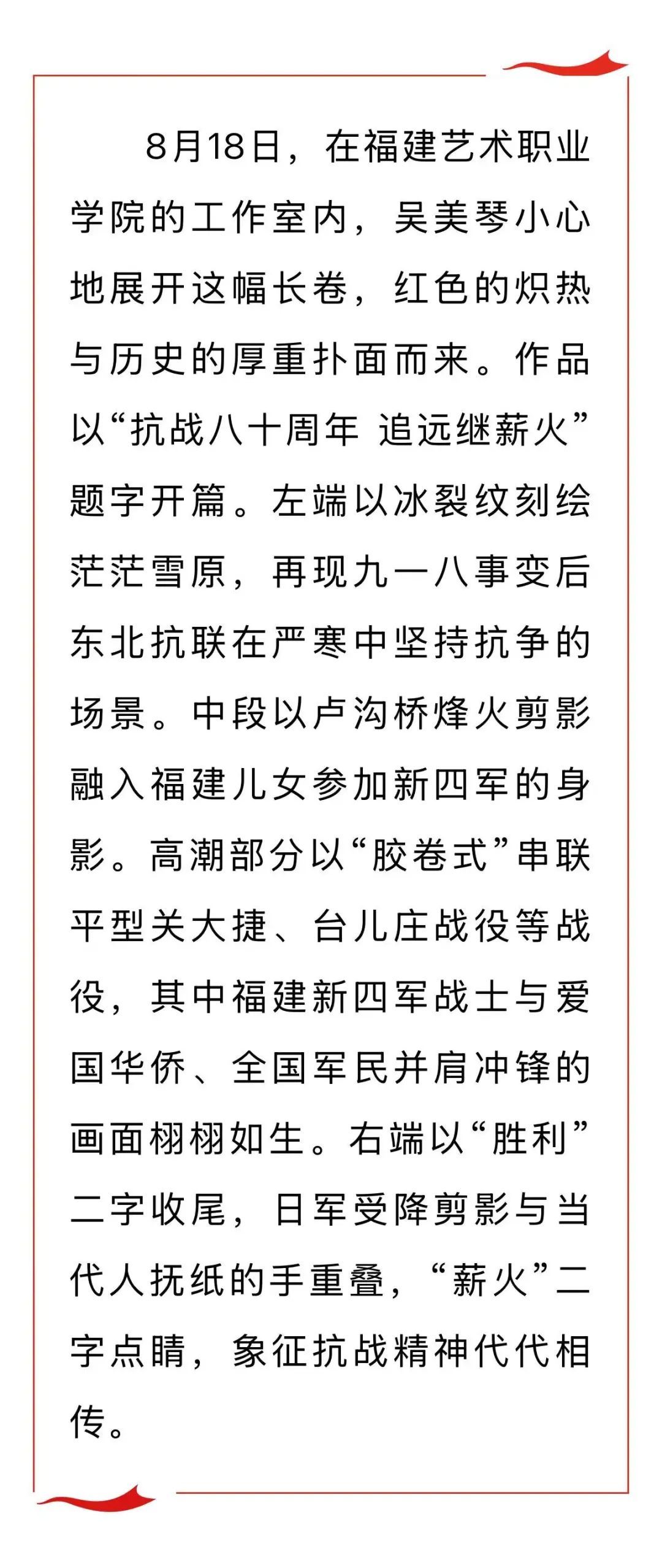 吳美琴表示,這幅作品是她為了紀念中國人民抗日戰(zhàn)爭暨世界反法西斯戰(zhàn)爭勝利80周年,在母校福建藝術職業(yè)學院工作室內(nèi)創(chuàng)作出來的。今年5月下旬她便著手準備,到完工歷時近3個月。為精準再現(xiàn)歷史,她專程走訪新四軍紀念館,查閱大量史料,并向講解員深入了解抗戰(zhàn)歷程及福建新四軍的貢獻。