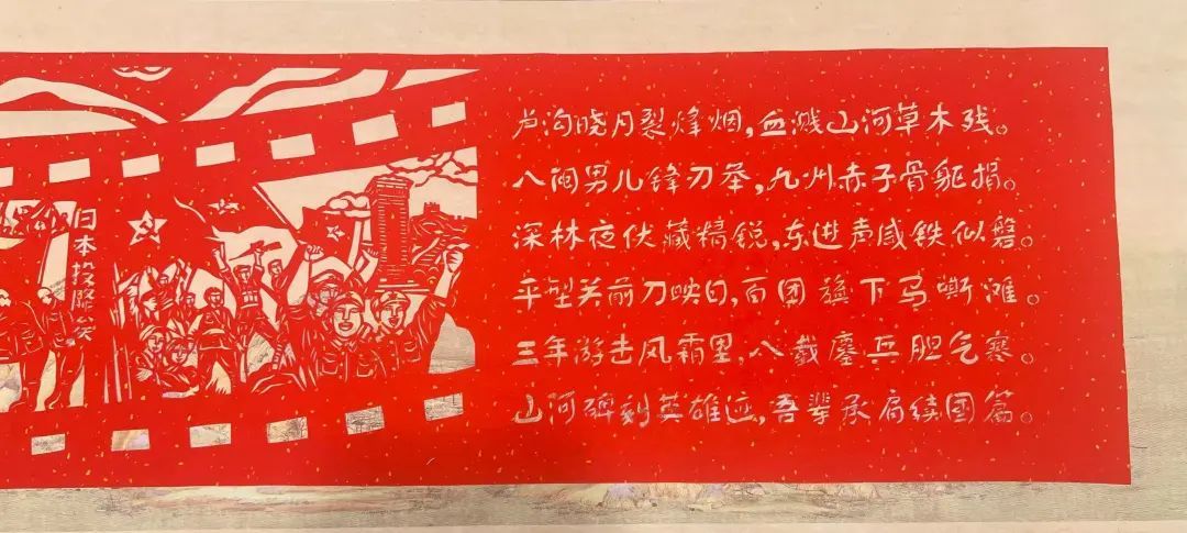 近日,由省剪紙協(xié)會會員、福州閩侯侯官剪紙工作室創(chuàng)辦人吳美琴創(chuàng)作的10米抗戰(zhàn)主題剪紙長卷完成。這幅以紅紙為載體,融合“電影故事放映式”手法完整鋪展14年抗戰(zhàn)脈絡的作品,彰顯非遺創(chuàng)新的同時鐫刻著家國情懷。