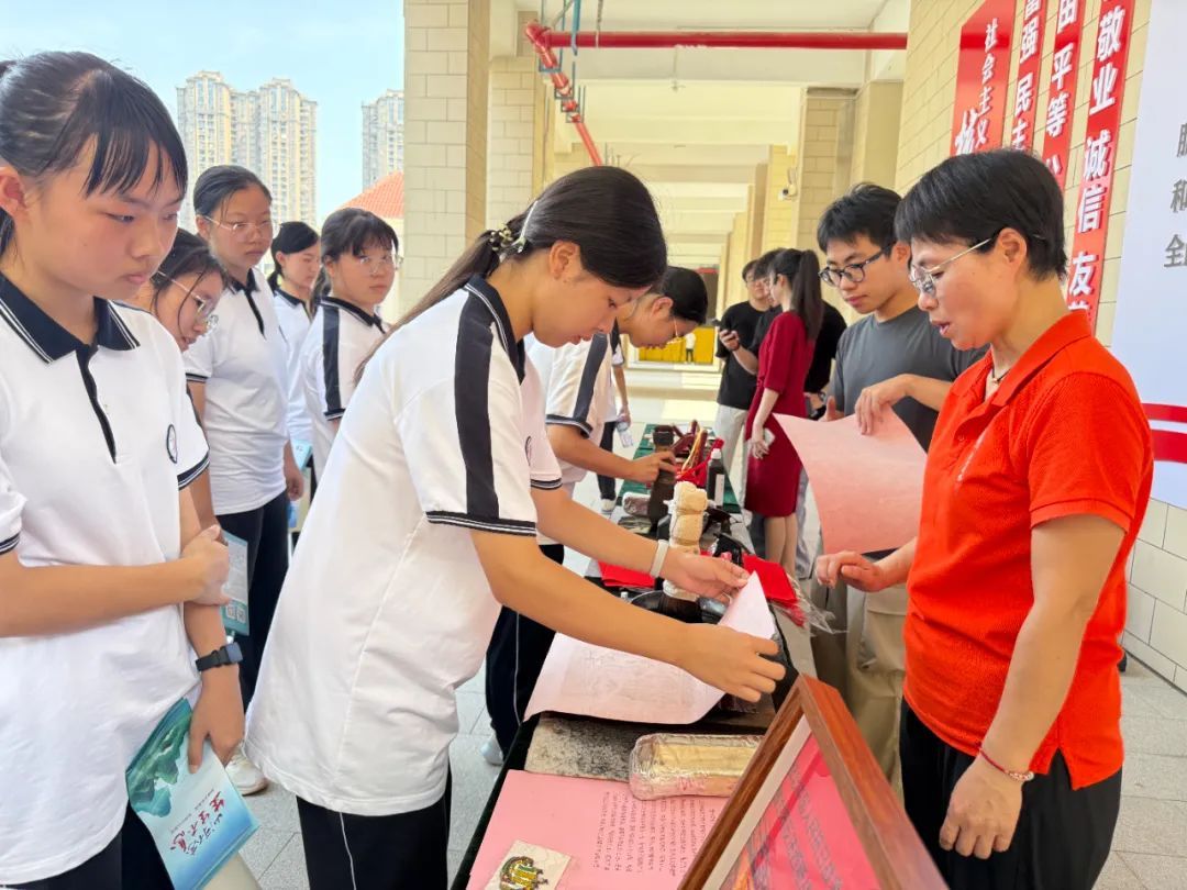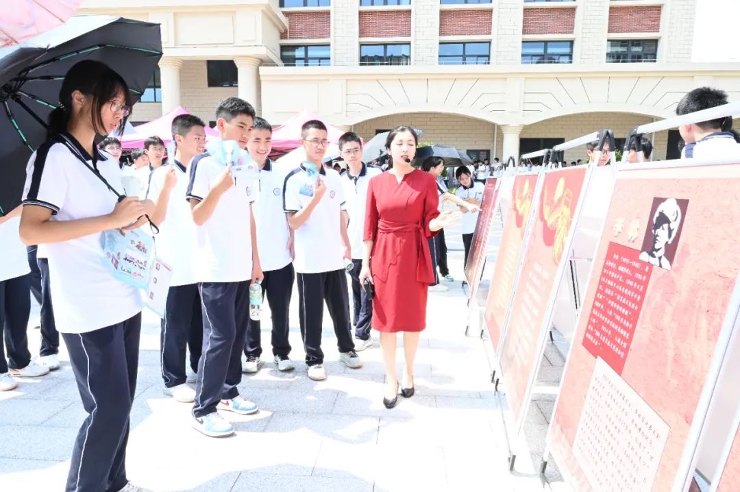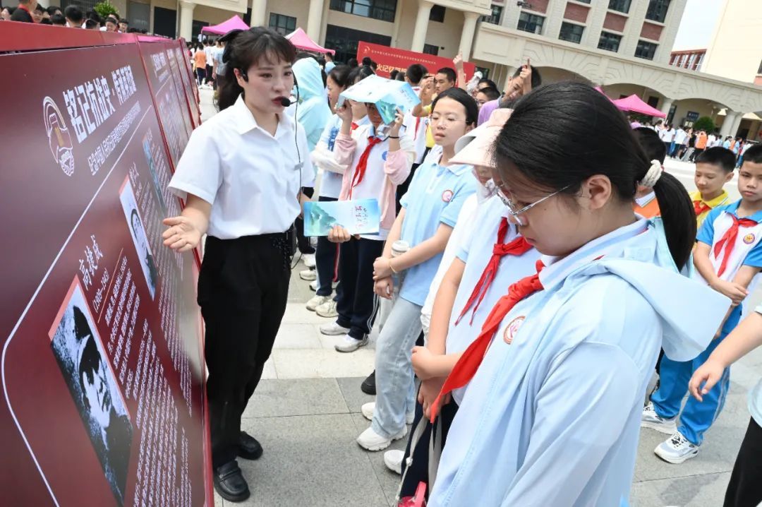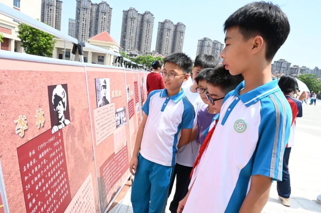 操場(chǎng)兩側(cè)排列著不同主題的展區(qū)與體驗(yàn)項(xiàng)目,學(xué)生們不再是坐在禮堂里被動(dòng)聽講,而是走進(jìn)一個(gè)個(gè)情境之中,成為歷史的親歷者、感受者和發(fā)問者。 不遠(yuǎn)處的抗戰(zhàn)英烈事跡展區(qū),十塊圖文展板靜靜矗立,呈現(xiàn)全國及漳州本地抗戰(zhàn)英烈的感人故事。展板前,漳州市烈士紀(jì)念設(shè)施保護(hù)中心的講解員動(dòng)情講述,學(xué)生們凝神傾聽,一本本英烈事跡宣傳冊(cè)在他們手中傳遞。年輕的面孔與黑白照片中的英雄,仿佛在這一刻跨越時(shí)空相遇。