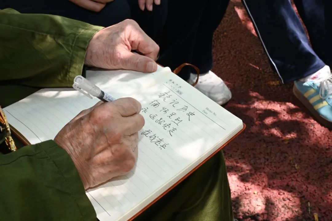 “張爺爺,您當(dāng)時(shí)害怕嗎?”“這枚紀(jì)念章對(duì)您來說意味著什么?”交流中,學(xué)生們踴躍提問,張老一一回答,并提筆勉勵(lì)大家:“銘記歷史,緬懷先烈,永遠(yuǎn)跟黨走!”寫到動(dòng)情處,他忍不住拍了拍學(xué)生的肩頭。