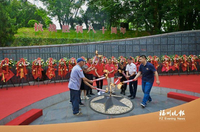 社會各界人士敬獻鮮花。 深切緬懷 燃傳承火種 佩戴起特制的抗戰(zhàn)勝利80周年紀念徽章,在紀念墻上鄭重簽名,與采集來的火種合影留念……8月31日8時許,福州抗日志士紀念墻前已是人頭攢動,早早來到這里的人們,以各種方式表達崇敬之情。 凝視福州抗日志士紀念墻,墻上8564個名字熠熠生輝,每一個名字背后,都是一位在民族危亡之際挺身而出的抗日志士,都有著一段可歌可泣的英雄故事。“我父親是抗日志士鄭其土。”鄭方干在父親名字旁貼上小小的五星紅旗,“這是告慰先人的一種方式,我們沒有忘記他們,大家都沒忘記他們!”記者看到,許多抗日志士姓名旁都貼上了小小的五星紅旗。 戴著紀念徽章的兩位抗日志士——97歲姜汝煥和101歲陳世明的到來,吸引了眾人的目光?!昂芨吲d,看到很多熟人?!标愂烂餍呛堑啬贸鲈缫褜懞玫膬蓮堉杏⑽念}字贈與福建省閩浙贛邊區(qū)革命史研究會會長凌冰。一張寫著“大力弘揚偉大抗戰(zhàn)精神”,一張寫著“銘記歷史 緬懷先烈”,這是老人對后輩的諄諄囑托。 9時03分,穿透時空的號角聲響起。這號角,是告慰,亦是召喚,喚醒人們共同的歷史記憶?!皠倮??和平——紀念中國人民抗日戰(zhàn)爭暨世界反法西斯戰(zhàn)爭勝利80周年活動”在號角聲中拉開帷幕。隨后,全場肅立,《義勇軍進行曲》的激昂旋律回蕩在紀念園上空,嘉賓們向福州抗日志士紀念墻行注目禮,用最莊重的方式致敬英烈。 活動現(xiàn)場,工作人員向抗日志士姜汝煥和陳世明獻花;主辦方及參與單位代表向紀念墻敬獻花籃并整理綬帶。朵朵鮮花寄托哀思,條條綬帶承載敬意,訴說著后人們對前輩先烈的深切緬懷。 抗戰(zhàn)的精神需要薪火相傳。現(xiàn)場大屏幕上播放的“薪火八閩”采集視頻,帶領(lǐng)大家回顧1個月來的火種采集歷程——從福州八一七烈士墓到福建省閩浙贛邊區(qū)革命紀念碑、福建省閩粵贛邊區(qū)革命紀念碑,從閩侯大湖抗戰(zhàn)遺址到陳紹寬上將故居、福州解放紀念碑、福州長江支隊紀念園,每一處都是一段悲壯史詩,每一簇火苗都是一粒不滅的精神種子。 在眾人注視下,抗日志士姜汝煥和陳世明從火種臺引出火種,并為9位抗日志士后人點燃火炬,再由他們共同執(zhí)火炬點燃“抗戰(zhàn)精神傳承長明火”。跳躍的火焰升騰而起,象征著無數(shù)抗日志士用鮮血和犧牲鑄就的抗戰(zhàn)精神將在一代又一代后人手中永續(xù)傳承、永不熄滅。