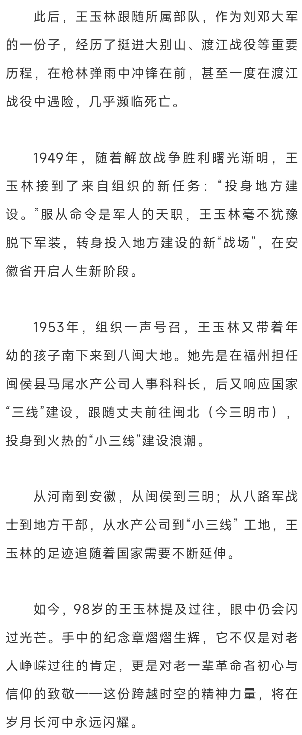 編者按: 為紀念中國人民抗日戰(zhàn)爭暨世界反法西斯戰(zhàn)爭勝利80周年,深入挖掘抗戰(zhàn)老兵事跡,傳承紅色基因,省退役軍人事務廳聯合各地市退役軍人事務部門開展走進抗戰(zhàn)老兵家庭,重溫抗戰(zhàn)歷史系列活動。廳官網官微開辟“致敬抗戰(zhàn)老兵”專欄對此進行系列宣傳,今日推出《98歲八路軍女戰(zhàn)士王玉林,收到這枚金燦燦的紀念章》的故事。 日前,一枚承載著敬意的“中國人民抗日戰(zhàn)爭勝利80周年”紀念章,由閩侯縣農業(yè)農村局工作人員帶到三明市,送到了今年98歲高齡,曾在閩侯縣工作生活過的八路軍女戰(zhàn)士王玉林家中。