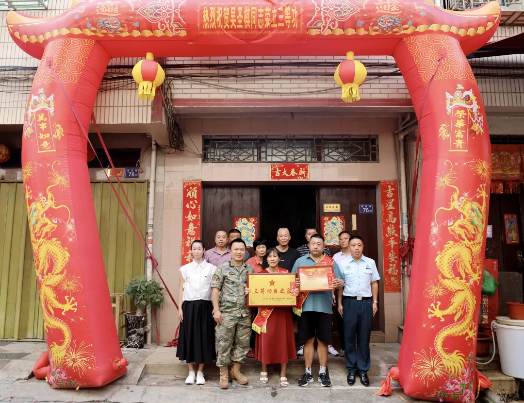 送喜報(bào)活動(dòng)結(jié)束后,軍地領(lǐng)導(dǎo)與蔡茂貴家屬親切圍坐在一起,詳細(xì)了解了蔡茂貴和家屬的工作、生活情況。蔡茂貴的父親感動(dòng)萬分,并表示他們作為軍人的后方,會一如既往地做好孩子的堅(jiān)強(qiáng)后盾,支持、鼓勵(lì)蔡茂貴立足本職崗位,再接再厲,為國防和軍隊(duì)建設(shè)作出更大貢獻(xiàn)。 南安市 吳圣棋榮立三等功 9月11日,南安市人武部政工科、南安市退役軍人事務(wù)局、官橋鎮(zhèn)武裝部、鎮(zhèn)退役軍人服務(wù)站和村“兩委”等多個(gè)單位負(fù)責(zé)人組成的慰問組,為官橋鎮(zhèn)金莊社區(qū)榮立三等功的現(xiàn)役軍人吳圣棋家庭送上立功喜報(bào),共同見證這一榮耀時(shí)刻。
