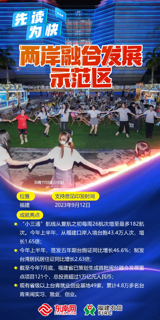一年來,中央和國家機關有關部門加大政策賦能,出臺在本領域貫徹落實《意見》的一系列配套文件和政策舉措;福建省制定貫徹落實《意見》的實施意見,現(xiàn)已發(fā)布兩批28條政策措施,廈門、福州、平潭、龍巖等地市出臺貫徹落實《意見》的區(qū)域性政策舉措。如今,兩岸融合發(fā)展示范區(qū)建設已形成一批先行先試經(jīng)驗,取得一批首創(chuàng)性對臺融合發(fā)展成果,福建正日益成為臺胞臺企“登陸”的第一家園。[詳細]
