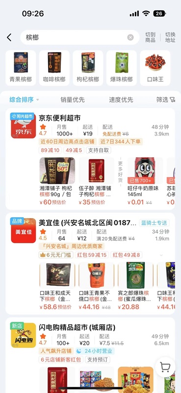 三明一學(xué)校附近,店鋪上方設(shè)置了醒目的檳榔廣告 電商平臺(tái)鮮有設(shè)限 記者也查看了多個(gè)電商平臺(tái),發(fā)現(xiàn)眾多檳榔產(chǎn)品琳瑯滿目,青果檳榔、咖啡檳榔、爆珠檳榔、枸杞檳榔、醬香檳榔等品類齊全,只需下單支付便可快速送達(dá),對(duì)買家是否成年并無特殊限制。 在美團(tuán)外賣定位福州,除了門店密集的萬嘉便利、六意便利、京東便利店等有檳榔在售,還有一刻便利、7+便利店、便利先生、鑫萬超文體便利(晨光文具)、佳盛文具便利、米熊倉鼠超市、奈斯優(yōu)選生活超市等均有售賣,買家可根據(jù)地域、喜好隨時(shí)下單。將定位調(diào)整為莆田、南平、寧德、三明、泉州等地,也有眾多店家提供檳榔外賣。 除了美團(tuán),記者也嘗試了永輝、樸樸、沃爾瑪、大潤(rùn)發(fā)等線上平臺(tái),未見檳榔銷售。不過,餓了么、多多買菜、淘寶、京東、拼多多等電商平臺(tái)大都貨品齊全,有的可選擇即時(shí)送貨,有的只能次日自提。就連閑魚也有檳榔可買。 檳榔在全省各地大行其道,唯有廈門較為特殊。在外賣平臺(tái)定位廈門搜索檳榔時(shí),出現(xiàn)的是“搜索結(jié)果為空”的提示。不過,這并不妨礙有心人從淘寶、京東等平臺(tái)下單購(gòu)買。